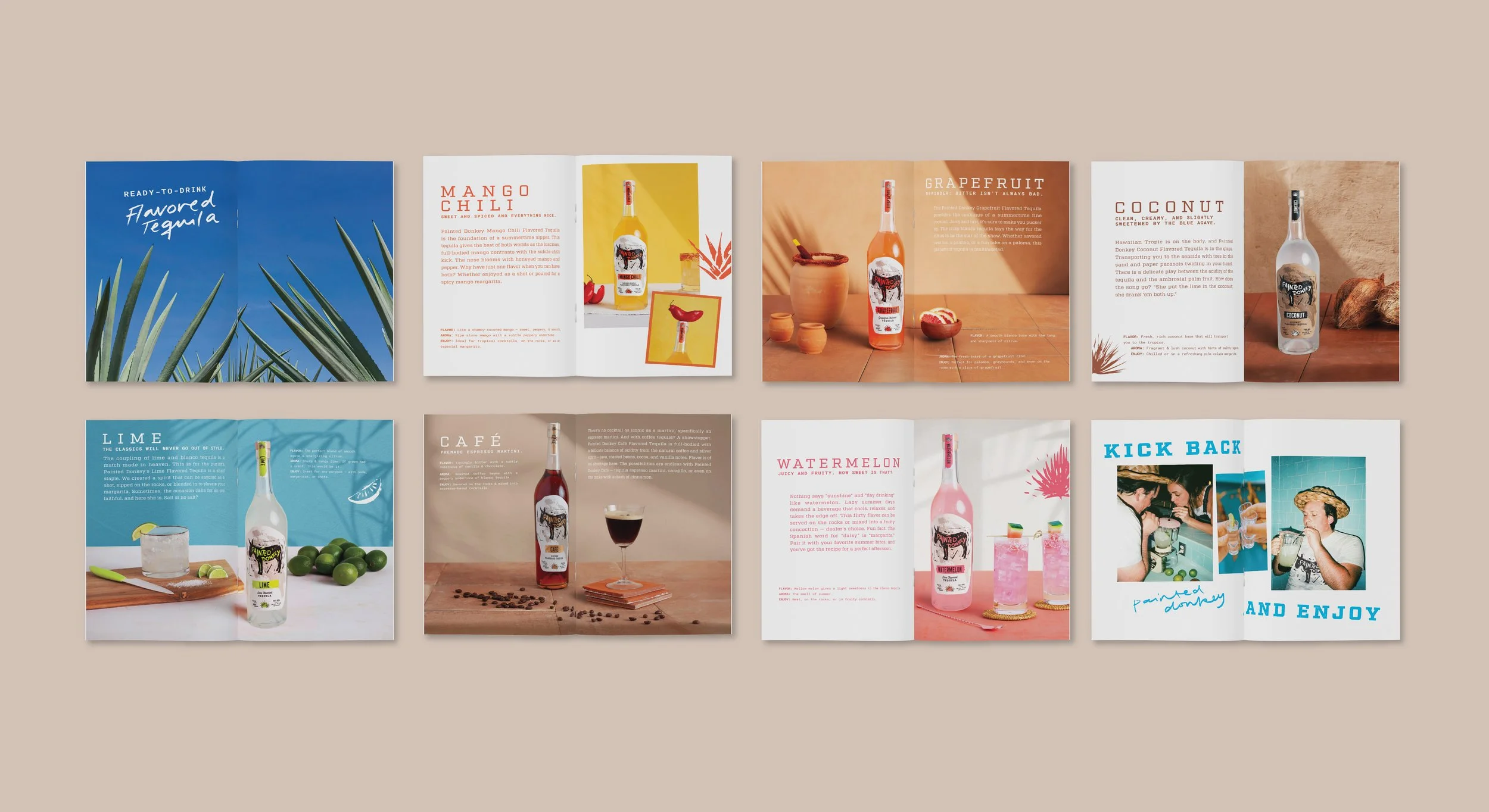 Painted Donkey sought a tangible way to capture their brand’s high-energy story for sales and events. I designed a custom brand zine that serves as a vibrant editorial deep dive into their world. To ensure a premium feel across their entire product line, I directed a hero photoshoot for their flavored tequilas, seamlessly integrating those custom shots with curated lifestyle photography. The result is a bold, colorful piece that functions as both a brand manifesto and a high-impact sales tool.